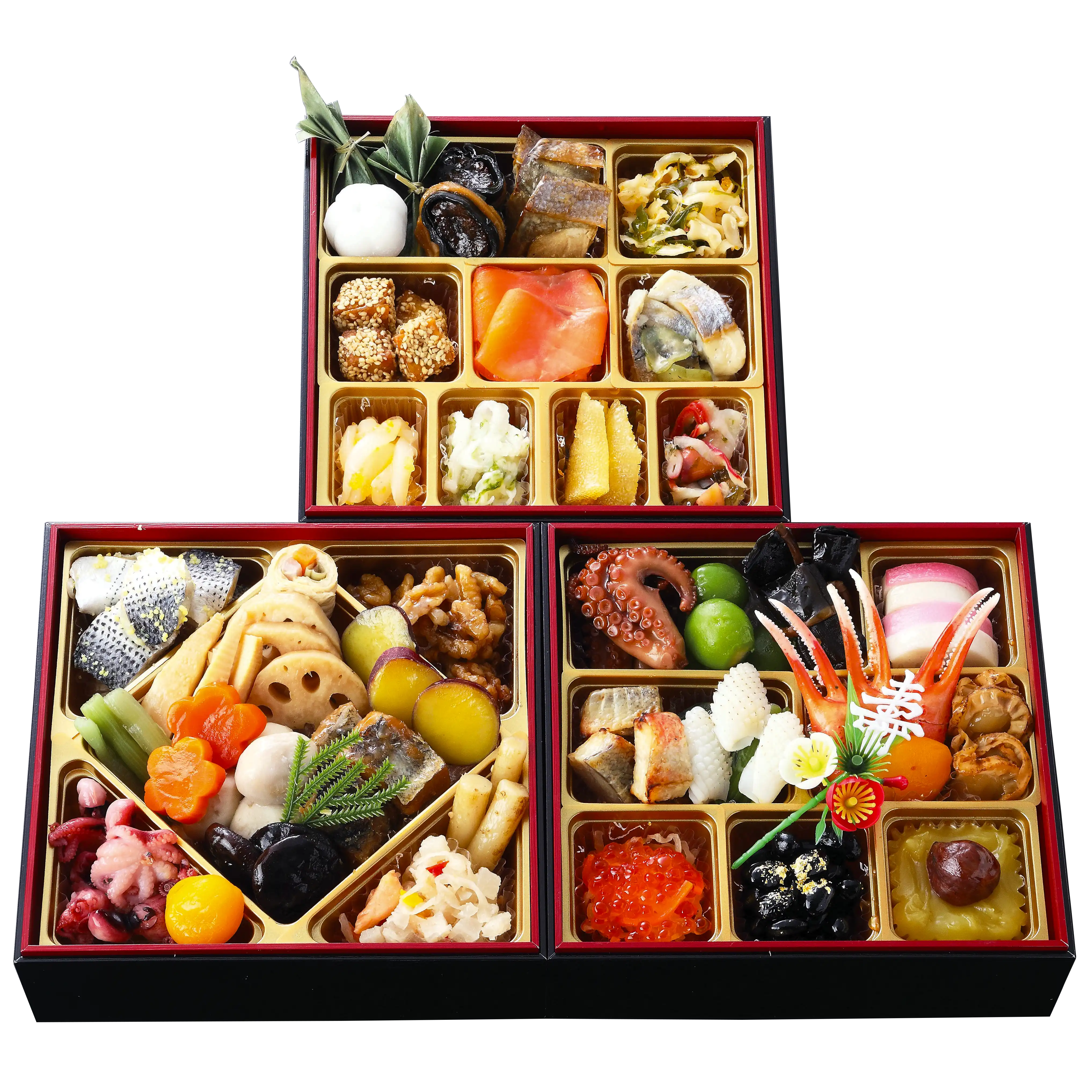 Top Tier: Simmered octopus/Sweetened young peach/Simmered kombu seaweed roll/Fish cake(red/white)/Grilled red rock sh with saikyo miso/Simmered Japanese mustard spinach/Grilled squid/Grilled crab claws with shell/Grilled seasoned scallop/Red and white vinegared salad/Seasoned salmon roe/Sweetened black beans w/gold leaf/Sweet chestnut paste/Candied Chestnuts with inner skin/Flavored apricot.